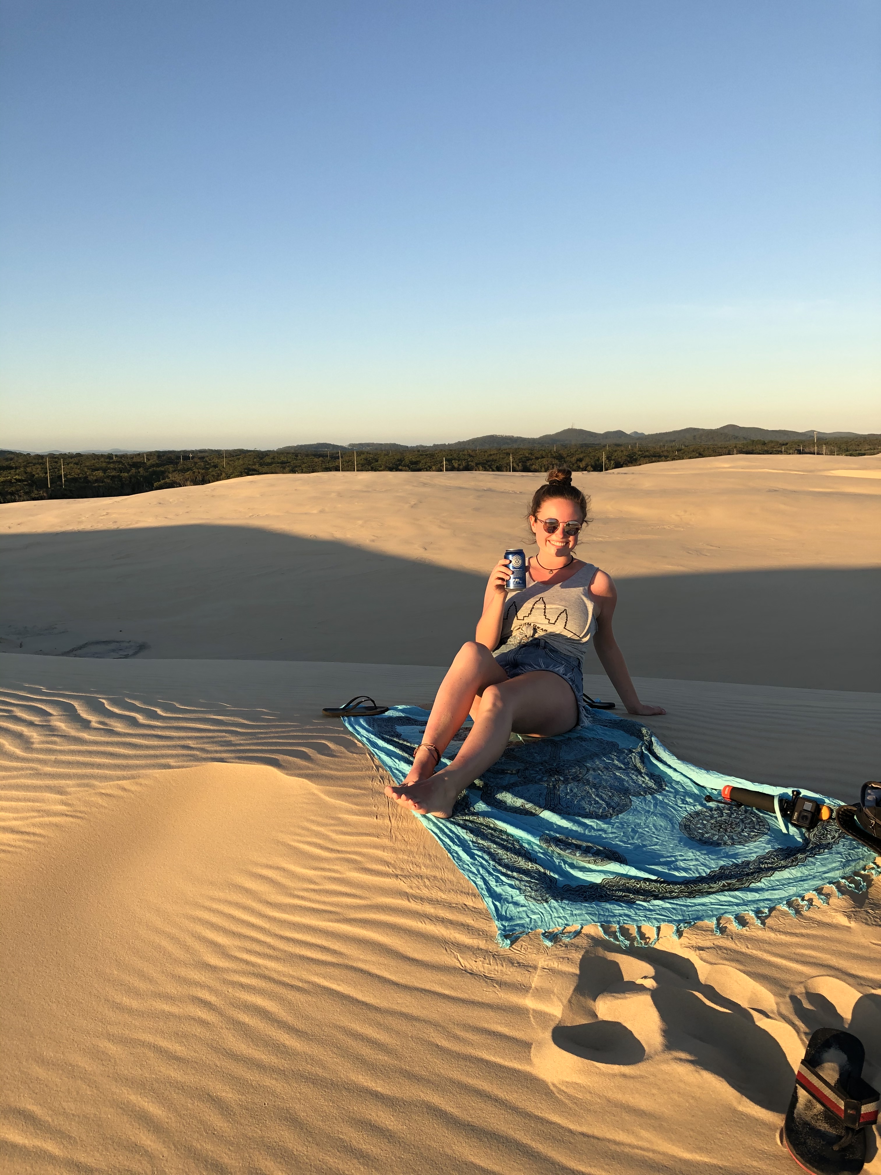 We set up the campervan, had a shower and then headed over to the sand dunes. We walked out of the back of the campsite and into a forest and then there we were … it kind of felt like a parallel universe. It was incredible .. sand mountains that went on for miles and miles and miles. We were both absolutely shocked. It was like we had stepped into the Sahara desert. We walked over the sand dunes and found a perfect spot to watch the sunset. We then cracked opened a couple of beers and were ready. The sunset was beautiful and the surrounding areas made it even more breathtaking.